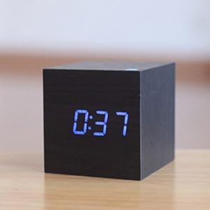 Bidason(ビダソン) デジタル 置き時計 LED 目覚まし時計 大音量 アラーム 温度表示 音声感知 USB給電 木目調 ナチュラル風 Clock キューブクリッククロック (黒・青字)